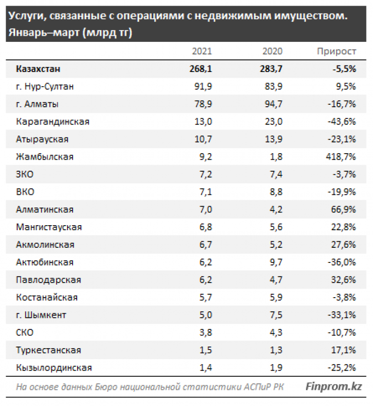 Аналитики отмечают, что объем услуг по операциям с недвижимостью в стране в первом квартале составил 268,1 миллиарда тенге. Этот показатель сократился на 5,5 процента по сравнению с прошлым годом, и это произошло впервые за семь лет, когда ежегодно объем услуг рос на 16,6 процента.