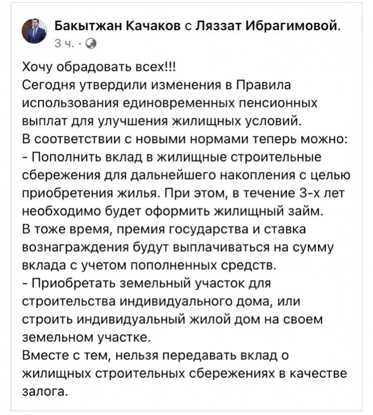 В Казахстане утвердили изменения в Правила использования единовременных пенсионных выплат для улучшения жилищных условий. Об этом вечером 10 декабря на своей странице в Facebook сообщил заместитель главы Комитета по делам строительства и ЖКХ Министерства индустрии и инфраструктурного развития Бакытжан Качаков, передает Tengrinews.kz.