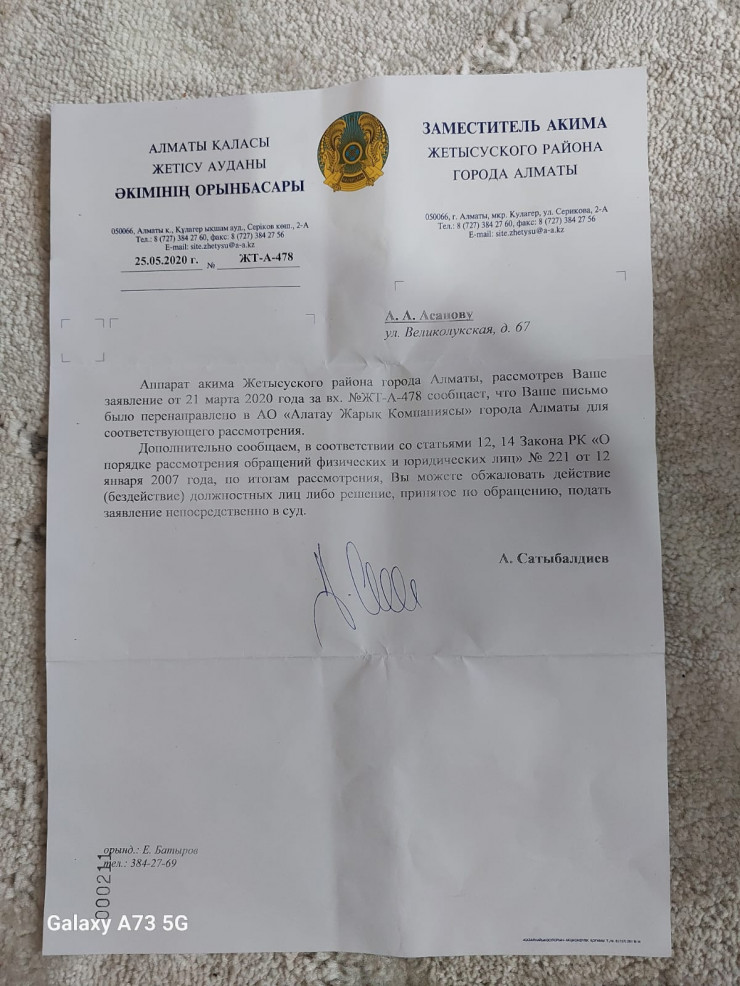 В аппарат акима района, действительно, поступило письмо от 20 июля 2020 года от Асанова А.А. о санитарной рубке дерева. Обратившемуся жителю был дан ответ, что зеленое насаждение находится на частной территории и санитарная рубка и обрезка должна проводиться собственными силами.