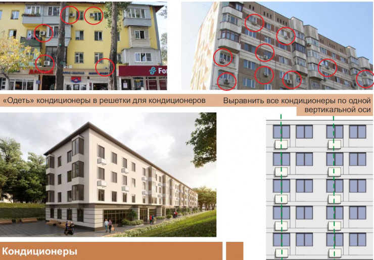 Авторы дизайн-кода отмечают, что сейчас имеется три основные проблемы. Фасады зданий в городе устарели, имеют разнотипные балконы, а несимметричные кондиционеры портят внешний вид.
