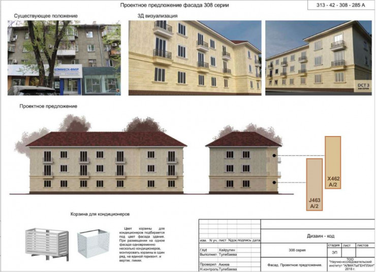 "Каждый закрывал балконы, как он мог, никто не соблюдал никаких границ, это уродует общий облик здания. Наше первое предложение - сделать рамки, за которые жильцы не смогут выходить, и использовать одинаковые материалы. Второй вариант - полностью открыть балконы и убрать остекление. А кондиционеры, которые  раскиданы по всему фасаду, мы предлагаем выровнять по оси и поставить в решетки одинакового типа", - рассказала ведущий архитектор НИИ "Алматыгенплан" Мадина Тулебаева.