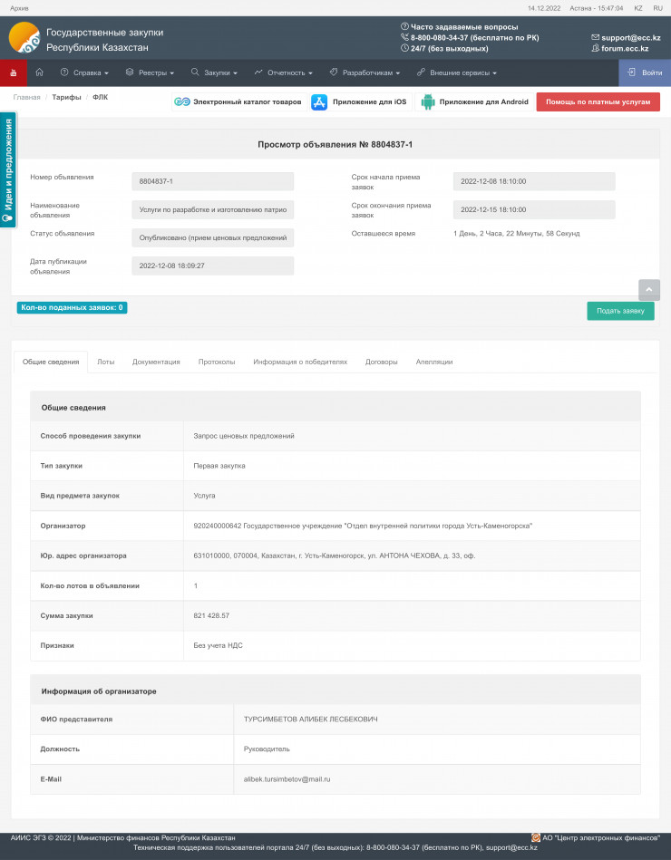 Об этом сообщается в объявлении на сайте госзакупок.