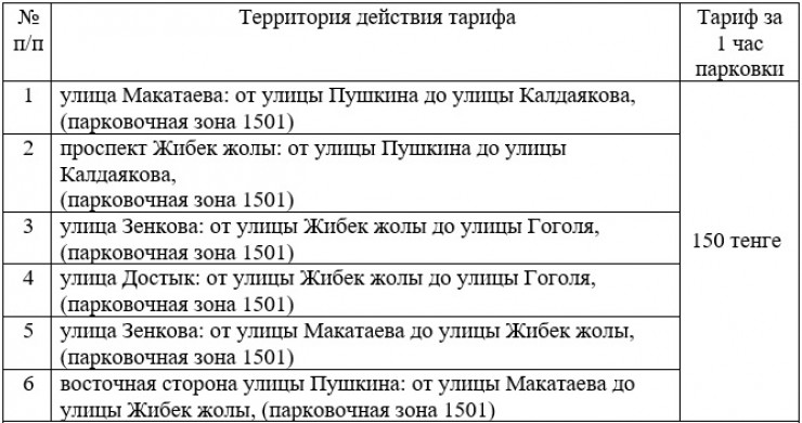 Городские власти предлагают изменить плату за автостоянку в районе рынка на 150 тенге за час. Новая цена на платную парковку в случае ее утверждения будет действовать по следующим адресам: