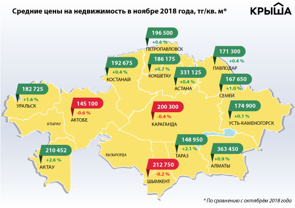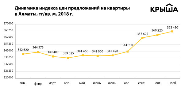 В Алматы индекс "Крыши" вырос на 0,9 процента, или 3 230 тенге. В ноябре он в очередной раз обновил годовой максимум и достиг отметки 363,5 тысячи тенге за единицу площади.