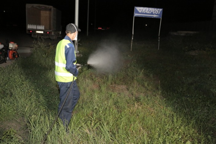 Обработка территории города ведется силами четырех районных акиматов. Работы ведутся с апреля до конца сентября и охватывают шесть туров. В данный момент завершается 3-й тур, следующий этап обработки открытых станций и водоемов начнется в 20-х числах июля.