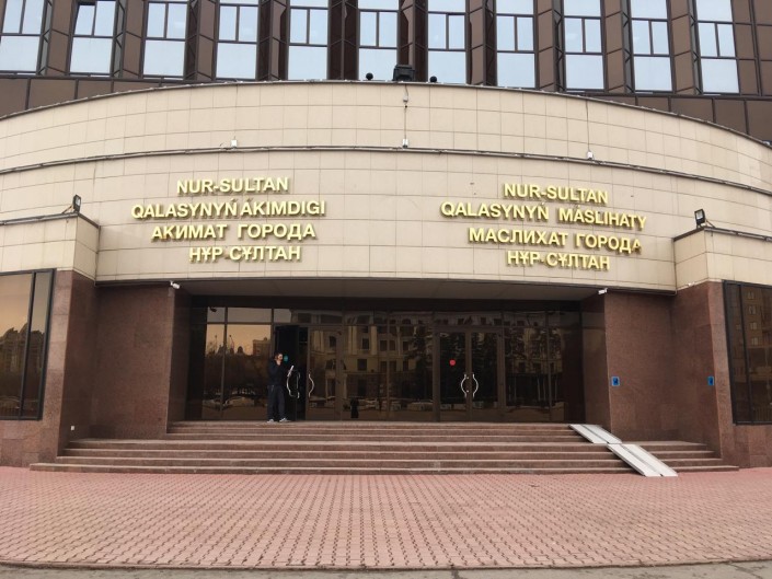 У главного входа в здание столичного акимата появились надписи на двух языках: "Nur-Sultan qalasynyń ákimdigi", а также "Акимат города Нұр-Сұлтан".