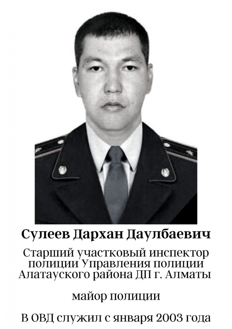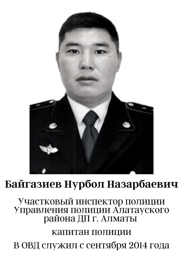 "Дархан Сулеев с 2003 года у нас работает. Окончил Академию МВД. Сейчас у него на иждивении осталось пятеро детей. Второй погибший - Нурбол Байгазиев. У него осталось двое детей. Он с 2014 года в полиции. Оба обслуживают этот участок в микрорайоне Акбулак. По службе их оценивали с положительной стороны, неоднократно поощрялись, со стороны населения на страницах в соцсетях были положительные отзывы, никаких нареканий не возникало", - сообщил Канат Таймерденов.