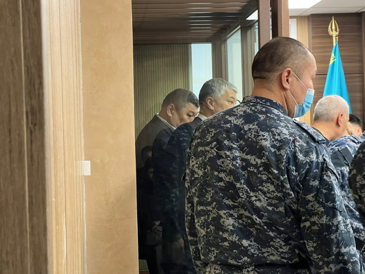 На скамье подсудимых три человека, в их числе Кайрат Боранбаев. Один из подсудимых находится под домашним арестом, остальные - под стражей.