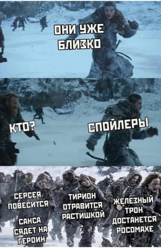 К слову, уже привычное за последний месяц словосочетание-предупреждение "Осторожно, спойлеры" обыграли пользователи сетей в виде мема. Asell Maratova опубликовала его на своей странице в Facebook.