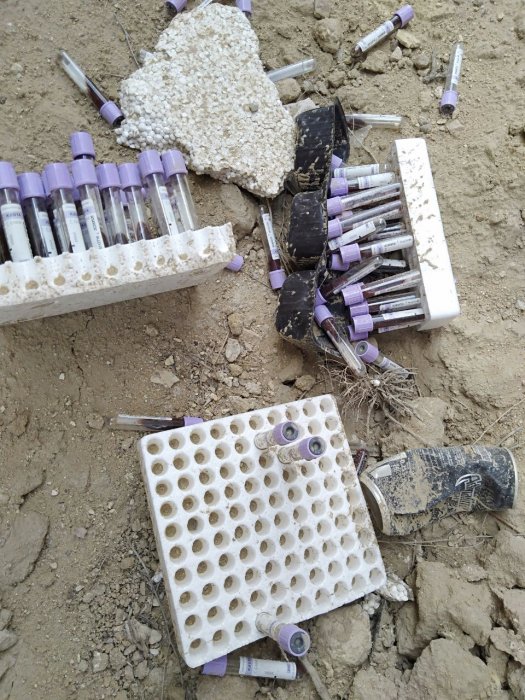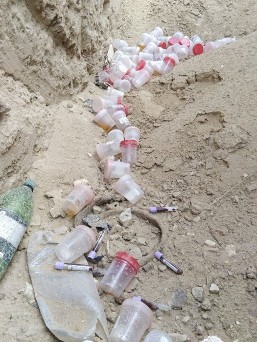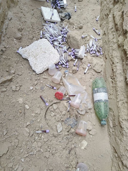 Местные жители нашли большое количество медотходов, в том числе пробирки с кровью и емкости для сбора мочи.