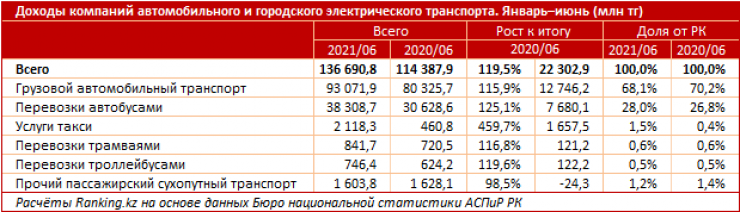 Доходы компаний автомобильного и городского электрического транспорта за полгода составили 136,7 миллиарда тенге - на 19,5 процента больше в стоимостном выражении, чем годом ранее.