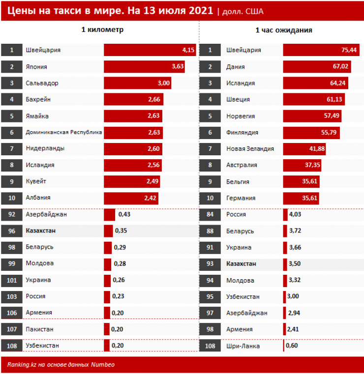 По состоянию на 13 июля самая высокая цена была зафиксирована в Швейцарии - 4,15 доллара, Японии - 3,63 доллара и Сальвадоре - три доллара. В Казахстане стоимость услуг такси в расчете на один километр составила 0,35 доллара - 96-е место по дороговизне из 108.