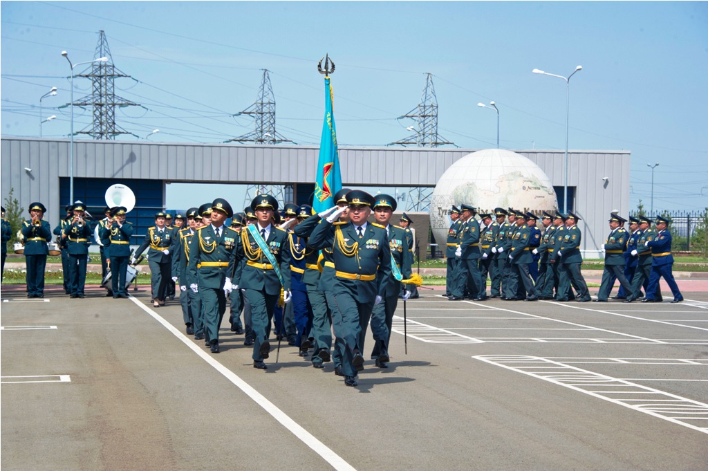 102 выпускника-офицера Вооруженных Сил РК построились на плацу университета, куда вынесли боевое знамя.