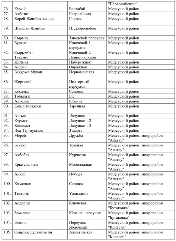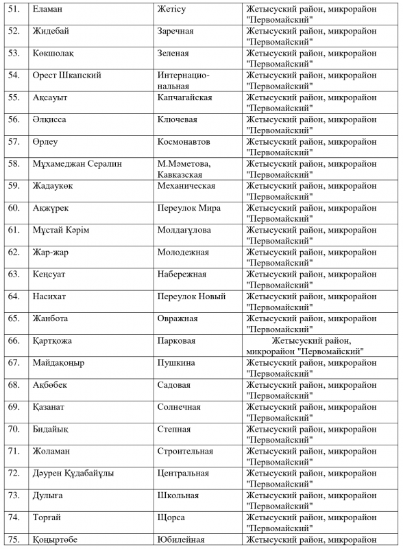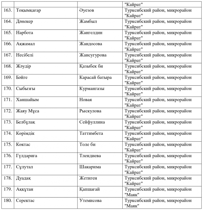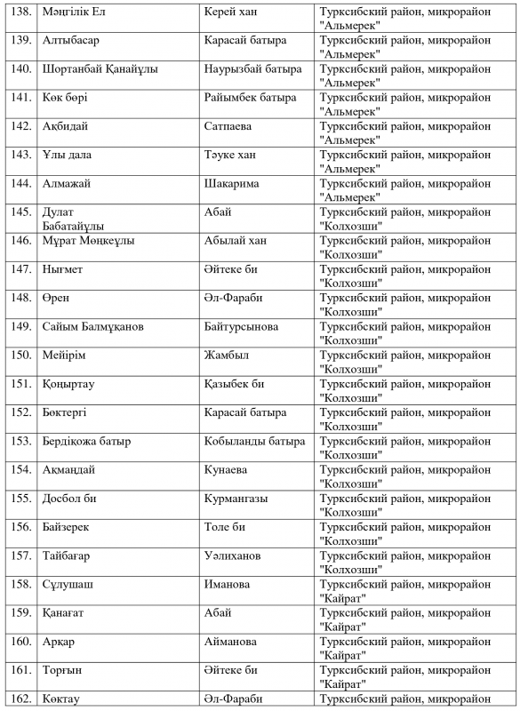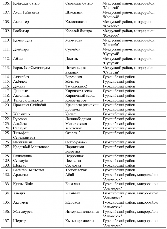 Ранее аким Алматы Бауыржан Байбек сообщил, что из трех тысяч алматинских улиц одинаковые названия имеют 250. Две сотни улиц - безымянные. По его словам, в городе есть 13 улиц Абая, 12 улиц Жамбыла. Даже район Алгабас пять раз повторяется.