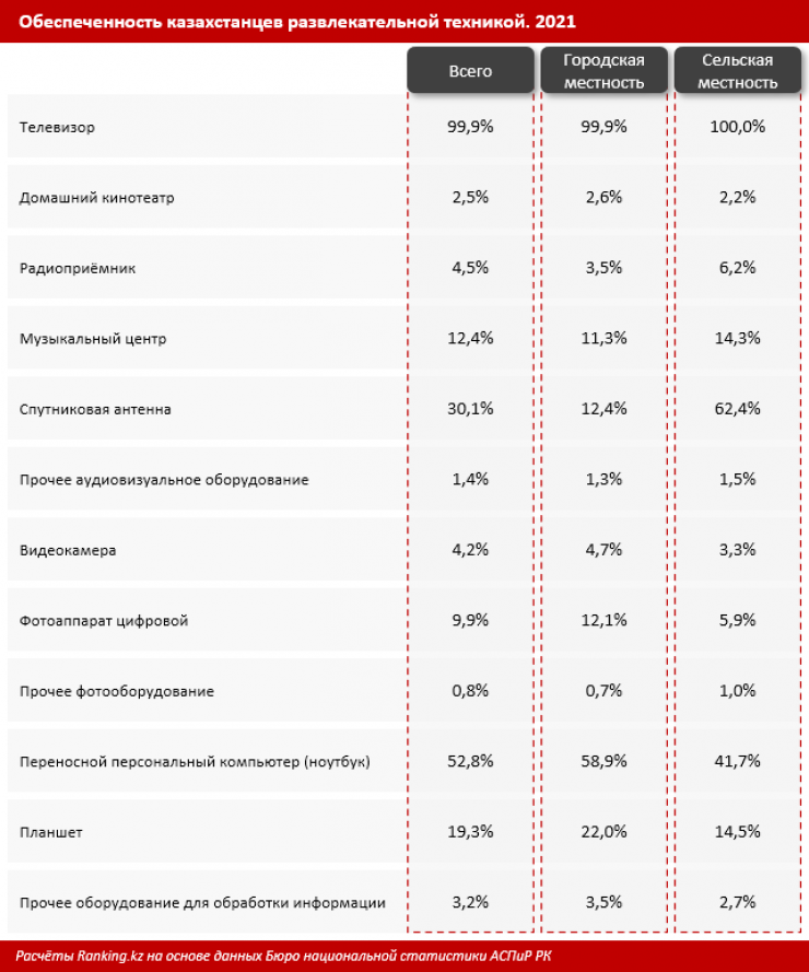 Музыкальные центры, видеокамеры, фотоаппараты, ноутбуки и планшеты чаще всего имелись в наличии у семей в Алматы, спутниковые антенны - у жителей Северо-Казахстанской области.