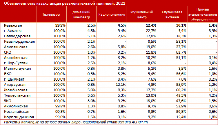 Телевизорами домохозяйства страны в 2021 году были обеспечены на высоком уровне: практически во всех регионах обеспеченность составила все 100 процентов. Исключением стали Акмолинская, Костанайская (по 99,8 процента) и Карагандинская (99 процентов) области.