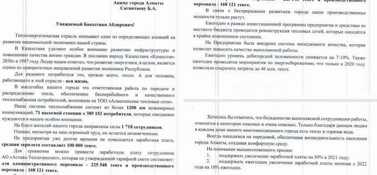 Сообщается, что в феврале этого года аким Алматы Бакытжан Сагинтаев поручил "изыскать возможности для повышения зарплаты производственникам "Алматинских теплосетей", кто в круглосуточном режиме бесперебойно обеспечивает город теплом и горячей водой".
