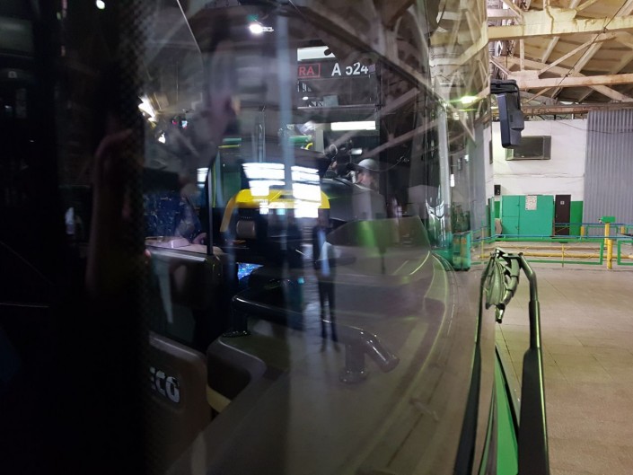 Заместитель председателя компании обратил внимание на лобовые стекла новых автобусов, которые, по информации специалистов, покрыты нитями из вольфрама, для предотвращения образования наледи.