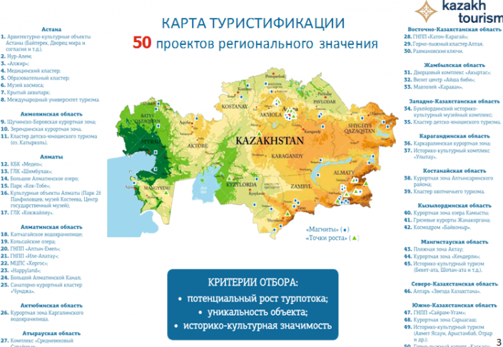 Как отметил заместитель председателя правления АО "НК "Kazakh Tourism" Кайрат Садвакасов, Глава государства определил 10 ключевых туристических точек роста.