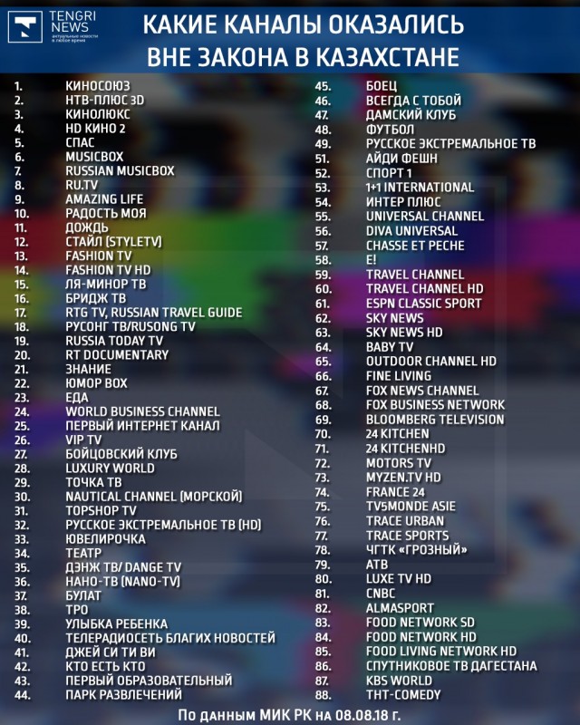 Сообщается, что в соответствии с поправками в закон "О телерадиовещании", принятыми в 2017 году, все иностранные теле-, радиоканалы, ретранслирующиеся на территории Казахстана, обязаны в течение шести месяцев со дня введения в действие закона зарегистрировать на территории РК юридическое лицо или провести учетную регистрацию своих филиалов в срок до 9 июля 2018 года. Закон вступил в силу 9 января.