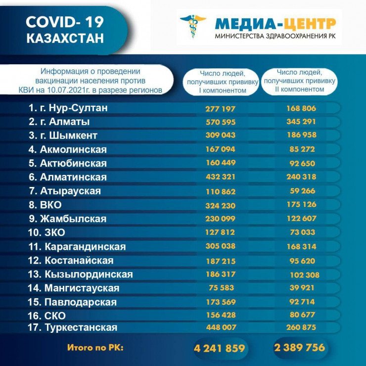 Число людей, получивших прививки первыми компонентами вакцин от COVID-19 на 10 июля, составило 4 миллиона 241 тысячу человек.