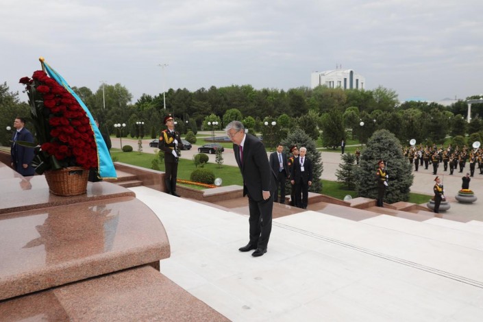 Возложение цветов к монументу прошло в ходе первого государственного визита Касым-Жомарта Токаева в Узбекистан.