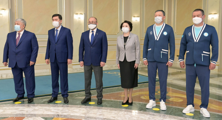 Основная часть спортсменов участвовала во встрече посредством телемоста из олимпийского центра "Акбулак" в Алматинской области, где проходят заключительные сборы перед отправкой в Токио.