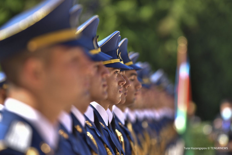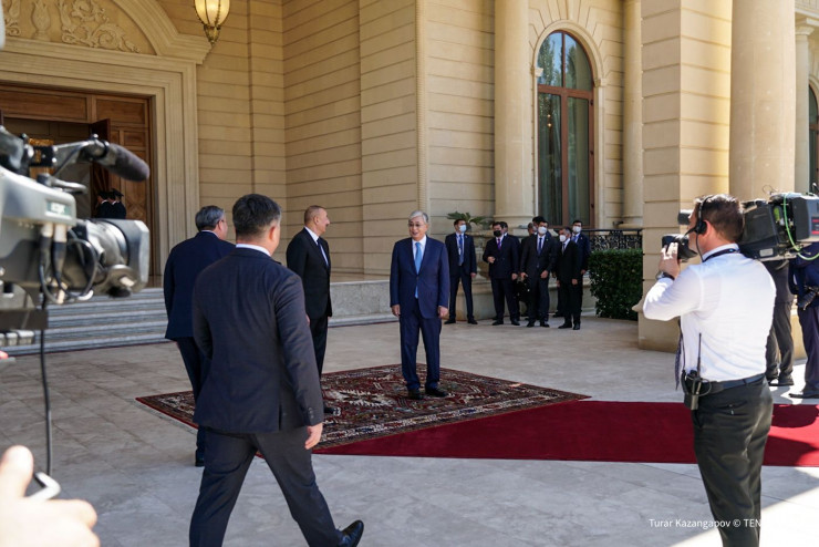 Церемония встречи прошла в торжественной обстановке. Алиев встретил Токаева у автомобиля.