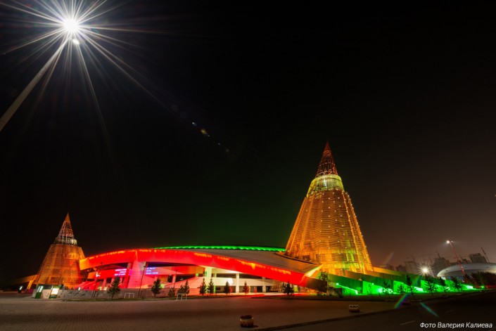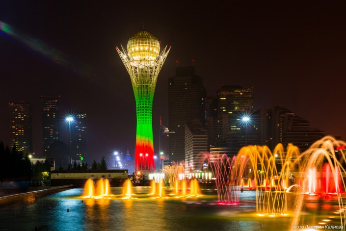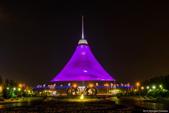 "Байтерек". Среди зданий и сооружений является главным брендом столицы. У каждого казахстанца, побывавшего в столице, имеется фотография на фоне "Байтерека". А есть ли у вас фото "Байтерека" в ночи? Высота сооружения составляет 97 метров, с шаром, венчающим конструкцию - 105 метров. По праву стал одной из главных достопримечательностей ночной Астаны и вошел в 90 эпических зданий планеты в рейтинге американской студии Pop Chart Lab. В подсветке главного символа столицы использованы управляемые полноцветные светодиоды, работающие совместно с прожекторами заливного света.