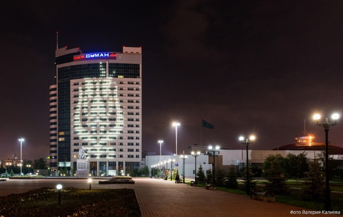 Гостиничный комплекс "Думан" - 18-этажная гостиница, скорее всего, является обладателем самого объемного ночного освещения с яркими инсталляциями. На здании установлены управляемые монохромные пиксели белого цвета.