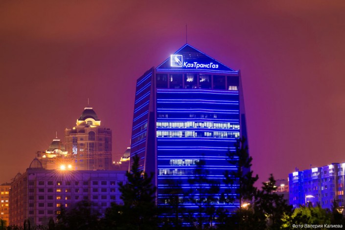 Архитектурное освещение КазТрансГаза стилизовано под "голубое пламя" и выполнено из самого современного и экономичного светодиода. В подсветке здания КазТрансГаза использовано 100 000 тысяч пикселей. Компания обслуживает 55 тысяч километров газопроводов, поставляет газ более 7 миллионам казахстанцев и по праву называется народной компанией, обеспечившей энергетическую безопасность страны.