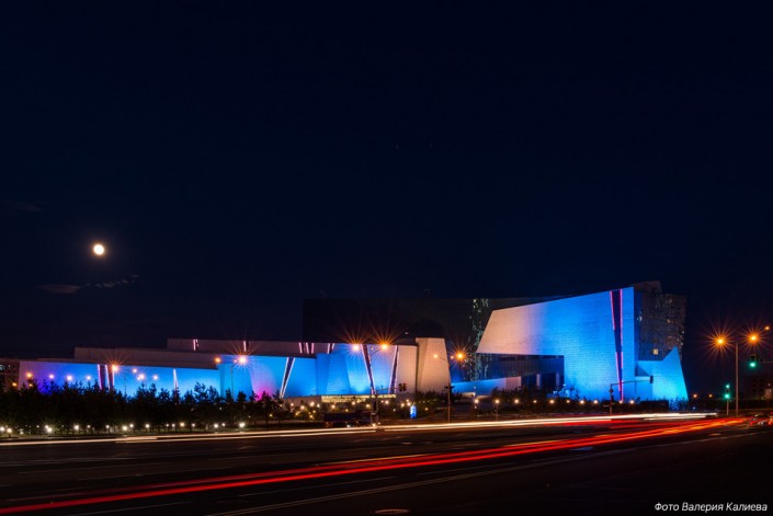 "Назарбаев центр". Ночная подсветка напоминает иноземное происхождение объекта, словно летающая тарелка накрыла Есиль. Техническая уникальность данного сооружения заключается в особой конструкции кровли, благодаря которой диаметр пролета достигает 81 метра. Уникальная подсветка здания "Назарбаев центра" состоит из светодиодных прожекторов заливного света, которые установлены внутри здания и направлены на стеклянную крышу.