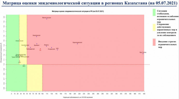 В "красной" зоне: города Нур-Султан, Алматы, Шымкент, Акмолинская, Атырауская, Западно-Казахстанская, Карагандинская, Мангистауская, Павлодарская области.