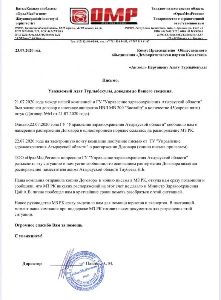В новом письме директор компании рассказал, что в Управлении здравоохранения Атырауской области им устно сообщили, что основанием для расторжения договора является распоряжение заместителя акима области Нурлана Таубаева.