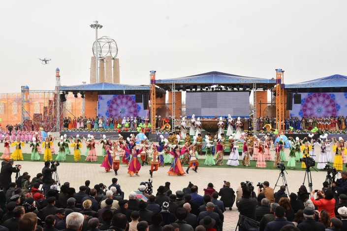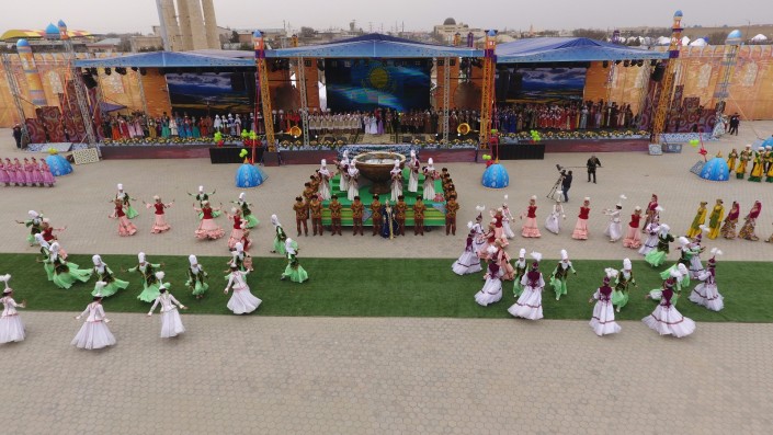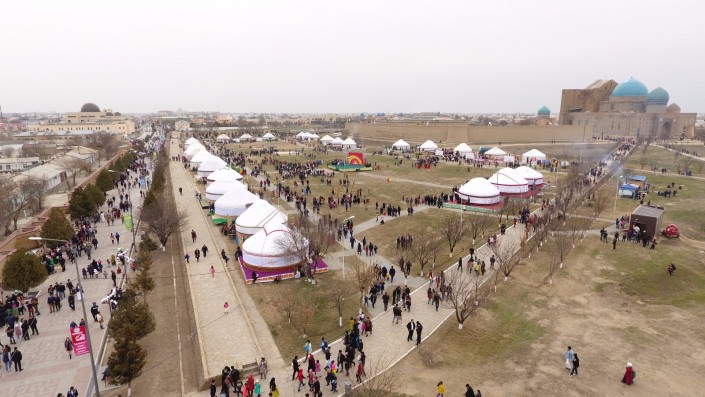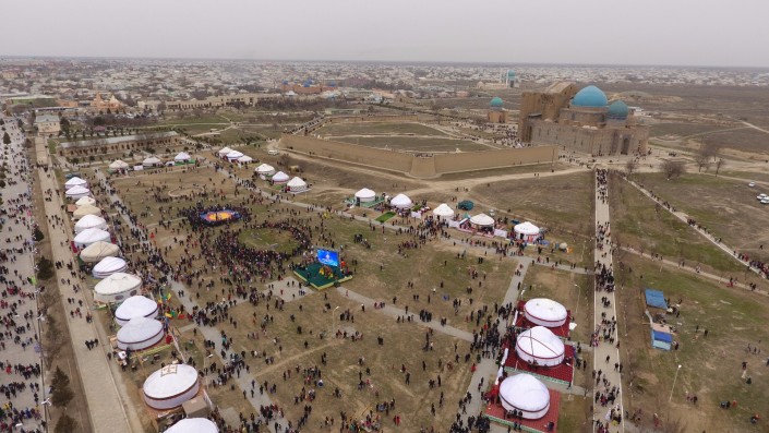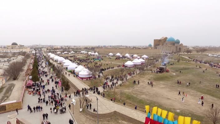 Масштабное действо развернулось во вторник, 21 марта, в одном из древнейших городов страны. Более 10 тысяч гостей встречали сегодня в Туркестане на праздновании Наурыза. Возле Мавзолея Ходжи Ахмета Яссауи был воссоздан этноаул: установлены 33 юрты, национальные качели алты-бакан, дастарханы, которые ломились от национальных угощений: казы-карта, жал-жая, кумыса, шубата, курта, иримшика, жента и многого другого. Только плова было приготовлено более тонны и более 1500 литров наурыз-коже. Таким образом южно-казахстанцы пытались показать гостям из 15 стран, что Туркестан на самом деле является культурной столицей Тюркского мира.