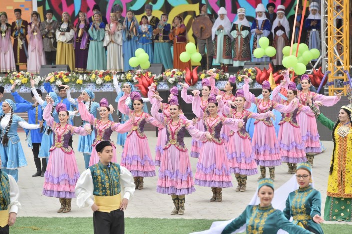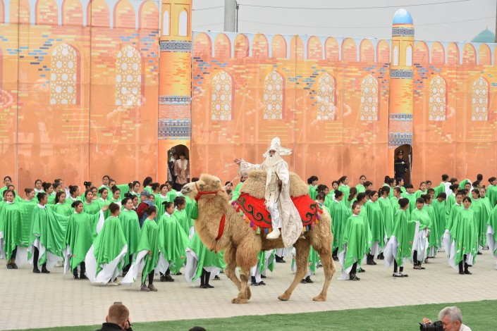 На сцене в это время развернулось театральное представление. Актеры были в образах Арыстан баба, Яссауи, аль-Фараби, Коркыт Ата, казахских ханов, а около 500 танцоров удивили всех масштабной хореографической постановкой. Кроме того, по площади прошел караван "Наурыз" из 18 верблюдов и 30 лошадей. Затем в присутствии тысяч человек малышу из Туркестана провели обряд тусаукесу. Путы перерезали аким ЮКО Жансеит Туймебаев и министр культуры и спорта Арыстанбек Мухамедиулы.