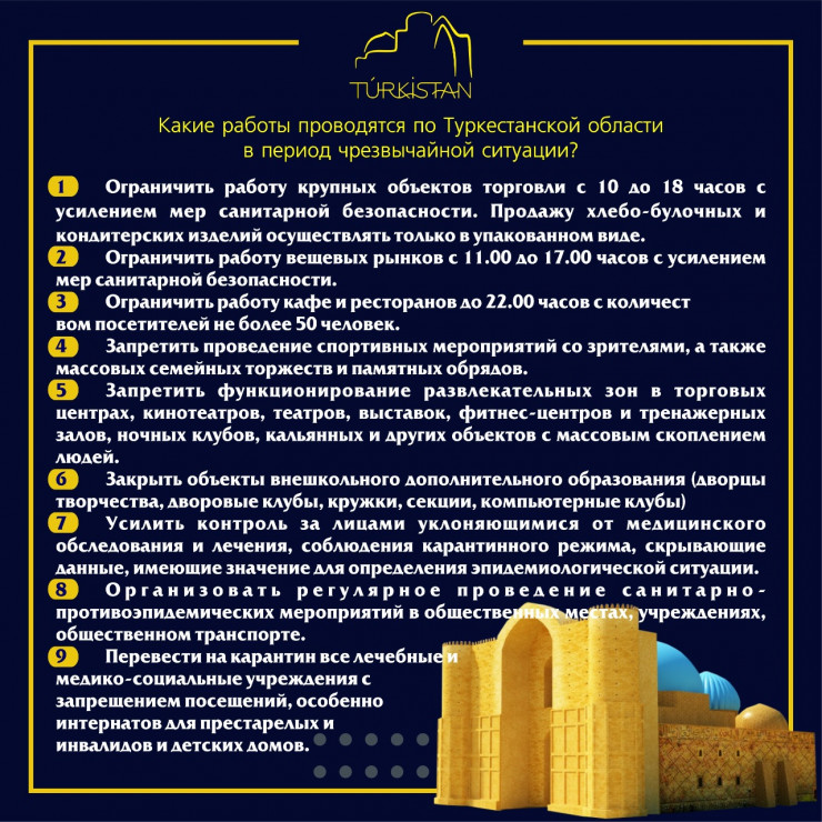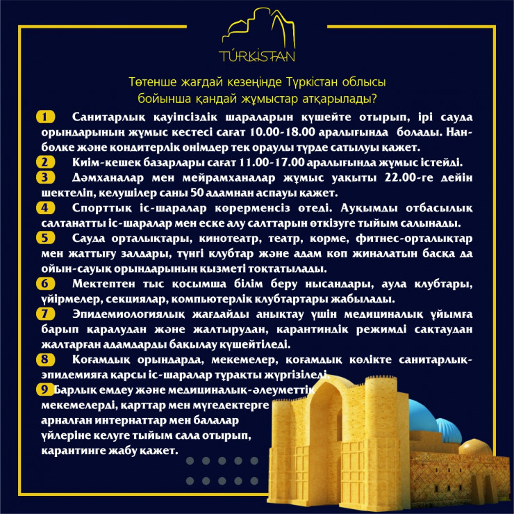 В связи с этим аким Туркестанской области Умирзак Шукеев принял постановление по реализации Указа Президента РК и поручил осуществить ряд мероприятий. В частности, для предотвращения распространения инфекции на территории области вводится режим повышенной готовности.