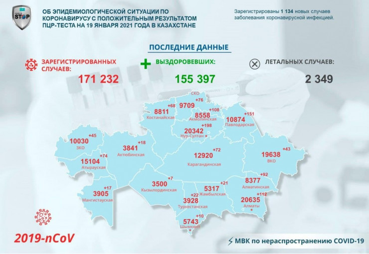 За прошедшие сутки 19 января в Казахстане зарегистрированы 1 134 новых случая заболевания коронавирусной инфекцией, передает Tengrinews.kz со ссылкой на Межведомственную комиссию по нераспространению COVID-19.