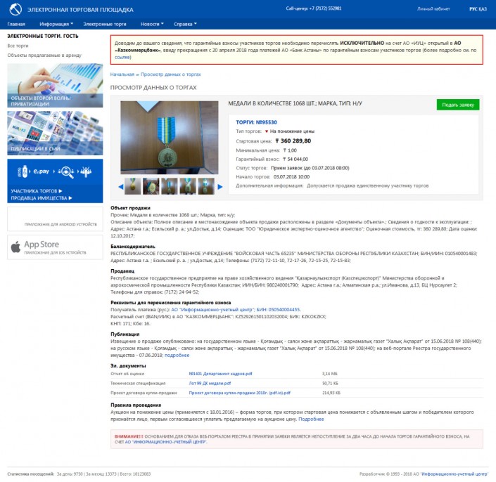 По итогам третьих электронных торгов от 3 июля 2018 года на понижение без установления минимальной цены медали были реализованы покупателем за 12 884 тенге по договору купли-продажи от 1 июля 2018 года.
