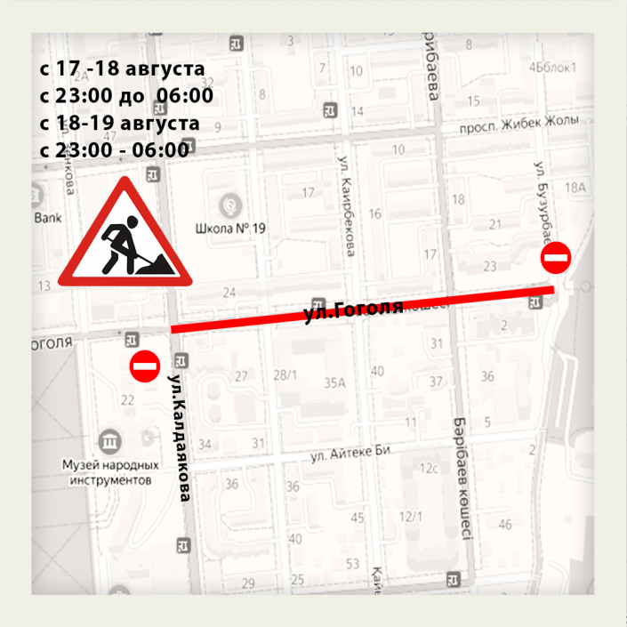 "В связи с дорожно-ремонтными работами на улице Гоголя участок от улицы Калдаякова до Центрального парка культуры и отдыха с 17 августа 23:00 до 18 августа 6:00 и с 18 августа с 23:00 до 19 августа 6:00 будет перекрыт. Во избежание заторов просим жителей и гостей города Алматы скорректировать свой маршрут заранее", - говорится в сообщении предприятия.