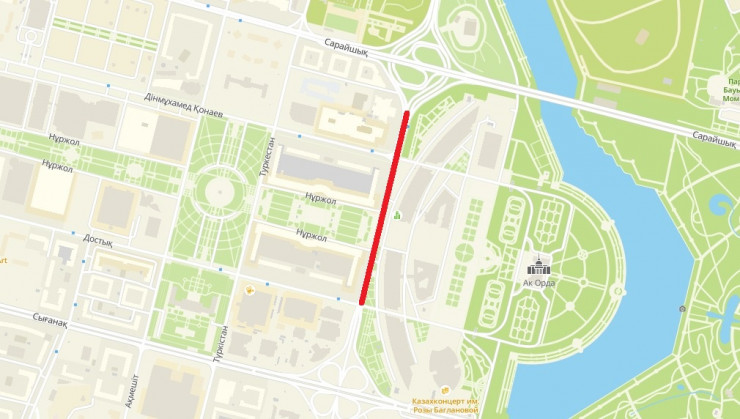 "В связи с этим со 2 по 8 августа будет полностью перекрыто движение для автотранспортных средств на участке от улицы Достык до транспортной развязки на пересечении улицы Сарайшык и проспекта Мангилик Ел", - говорится в сообщении.