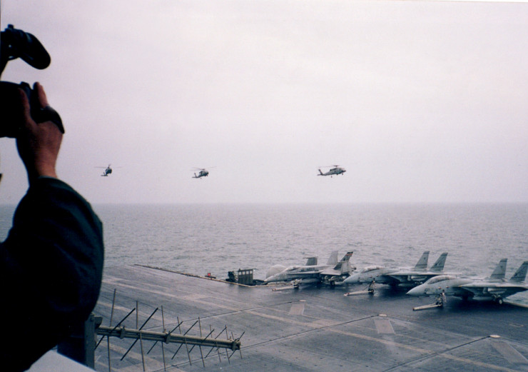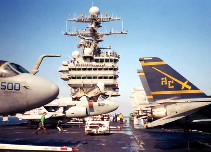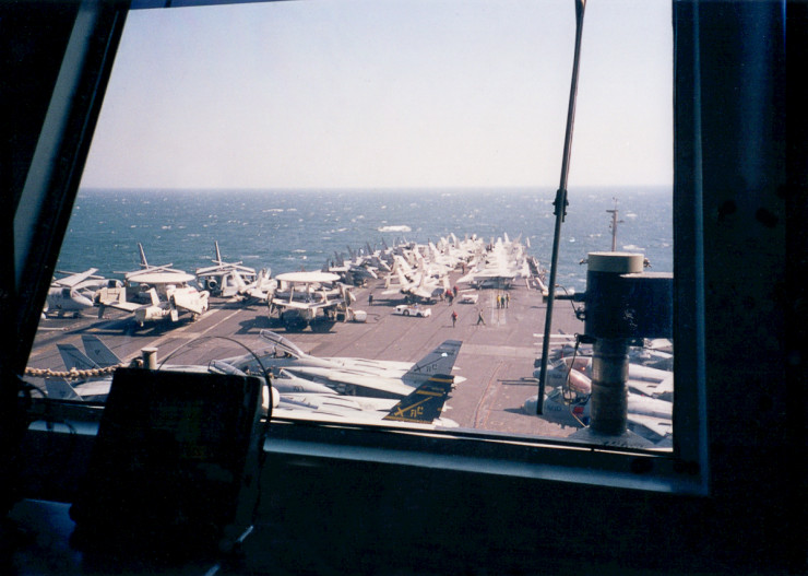 Вид на флай-дек из каюты мини-босса (сменного руководителя полетами). Кроме истребителей, на палубе слева стоят летающие радары Grumman E-2 Hawkeye и самолеты радиоэлектронного противодействия Lockheed S-3 Viking.