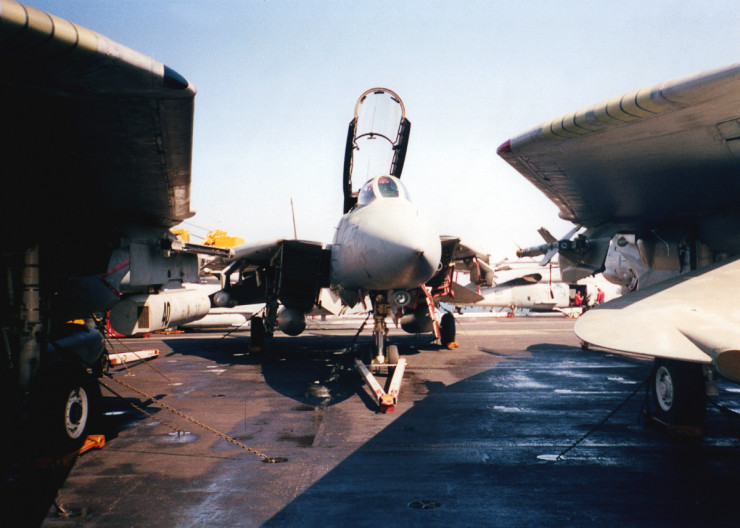 F-14 на стоянке. На заднем плане можно разглядеть палубный военно-транспортный вертолет Sikorsky SH-60 Seahawk.