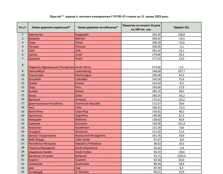 Теперь в "красный список" Украина включила государства, где количество новых случаев на 100 тысяч населения за последние 14 дней превышает аналогичный показатель в Украине. Или же если прирост числа инфицированных в них за последние 14 дней превышает аналогичный за прошедшие 14 дней на 30 процентов. Ранее Украина принимала во внимание количество активных больных с коронавирусом на 100 тысяч населения.