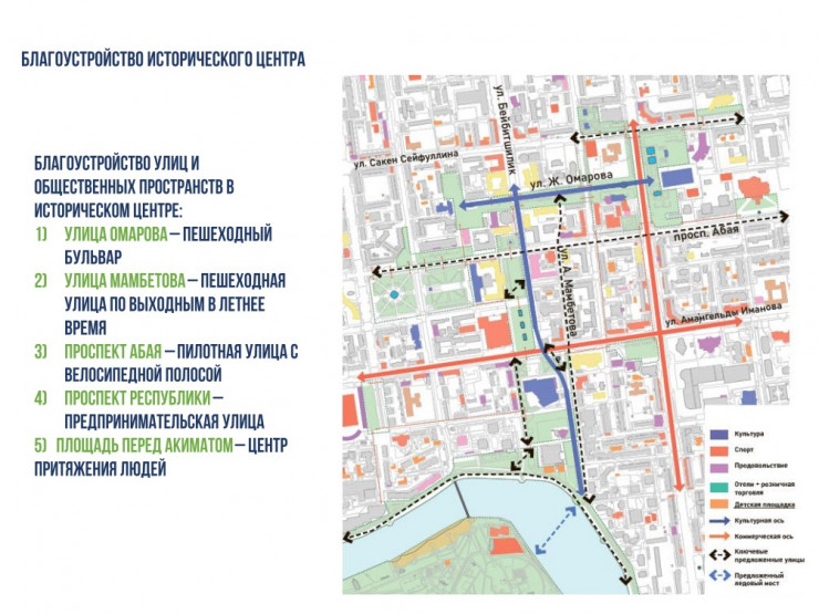 Планируется реконструкция улиц Абая, Сейфуллина, Республики, а также Сатпаева и Петрова. Улицы будут перепроектированы для комфортного перемещения пешеходов.