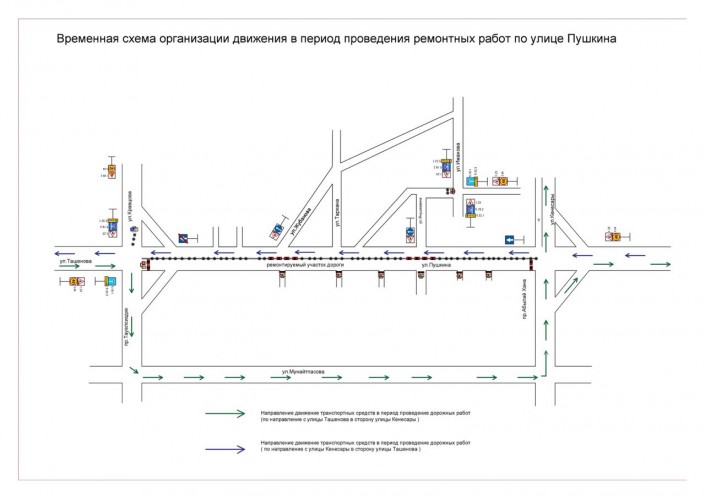 В этой связи с 11.00 7 сентября до 06.00 8 сентября и с 11.00 8 сентября до 06.00 9 сентября по улице Пушкина в направлении от проспекта Тауелсиздик до улицы Кенесары будет ограничено движение автотранспортных средств. Объезд будет организован через улицу Мунайтпасова.