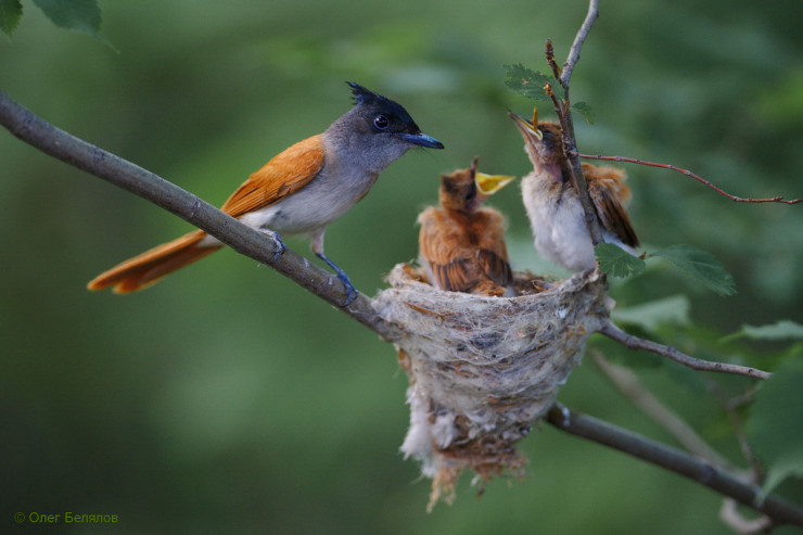 Райская мухоловка. Terpsiphone paradisi. "Самая яркая птица наших гор возле гнезда с птенцами"
