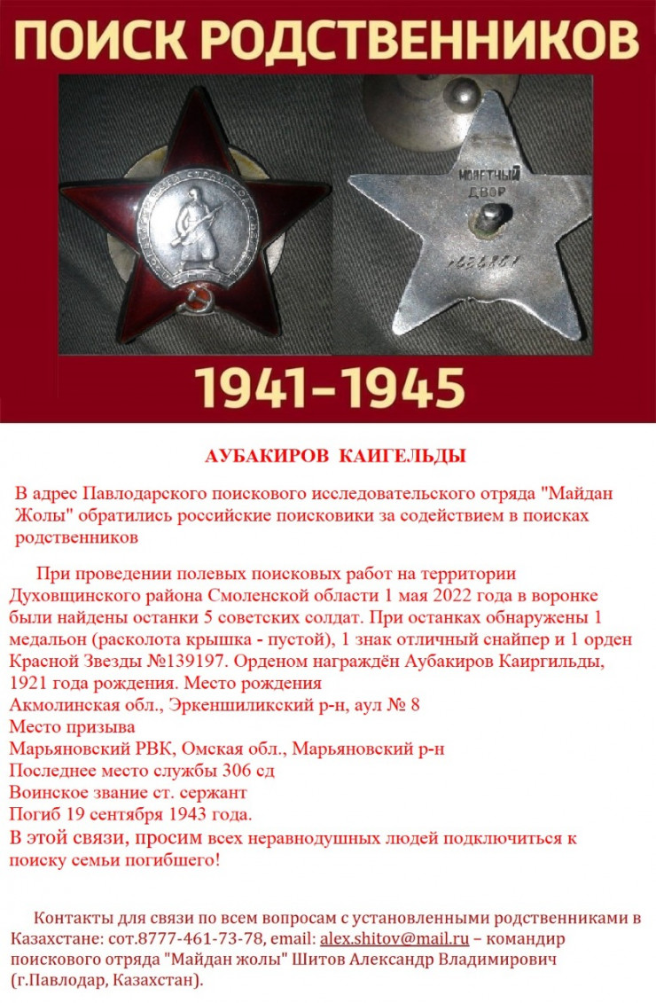 "При проведении полевых поисковых работ на территории Духовщинского района Смоленской области 1 мая этого года в воронке нашли останки 5 советских солдат. На месте также обнаружили пустой медальон с расколотой крышкой, знак "Отличный снайпер" и орден Красной Звезды. Орденом награжден наш земляк Каиргельды Аубакиров", - рассказал командир павлодарского поискового исследовательского отряда "Майдан жолы" Александр Шитов.