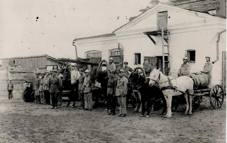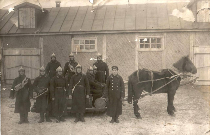 На старых снимках изображен конно-бочечный ход - повозка на конном ходу, на которой доставлялись к месту пожара огнеборцы, бочки с водой, пожарные насосы, оборудование и другие принадлежности.