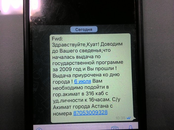 "Сейчас гражданам нашего города начали поступать SMS-сообщения такого характера: вы в 2009 году прошли по государственной программе жилищного строительства, вас на День города, 6 июля, ожидают в акимате города для вручения ключей и так далее. И подпись соответственно - акимат города. Кто это делает и с какой целью? Я думаю, правоохранительные органы, конечно, этим займутся", - сказал на брифинге в акимате Астаны руководитель столичного управления жилья Руслан Ахметов.